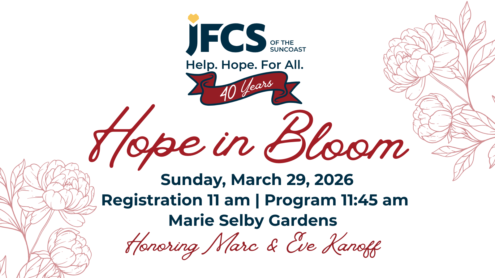 Jewish Family & Children’s Service of the Suncoast is turning 40, and we’re celebrating in style! Please join us for Hope In Bloom on Sunday, March 29, 2026, at the beautiful Marie Selby Botanical Gardens. The event will also honor Marc & Eve Kanoff for their many years of service to JFCS and our mission.