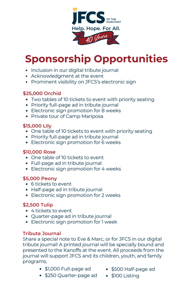 Jewish Family & Children’s Service of the Suncoast is turning 40, and we’re celebrating in style! Please join us for Hope In Bloom on Sunday, March 29, 2026, at the beautiful Marie Selby Botanical Gardens. The event will also honor Marc & Eve Kanoff for their many years of service to JFCS and our mission.